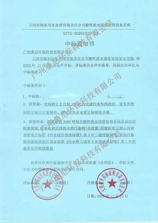 廣州桑尼環(huán)??萍加邢薰緟⑴c酸性廢水深度處理設(shè)備采購項(xiàng)目投標(biāo),以良好的信譽(yù)、豐富的經(jīng)驗(yàn)、強(qiáng)大的技術(shù)實(shí)力以及專業(yè)的方案、合理的報(bào)價(jià)贏得了招標(biāo)單位以及評(píng)標(biāo)專家的肯定,成功中標(biāo)。